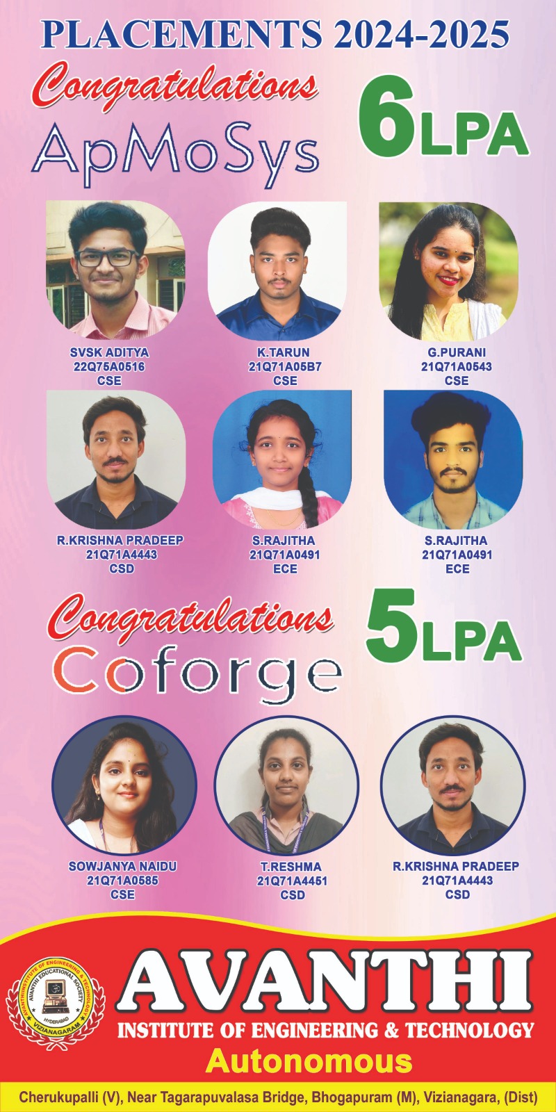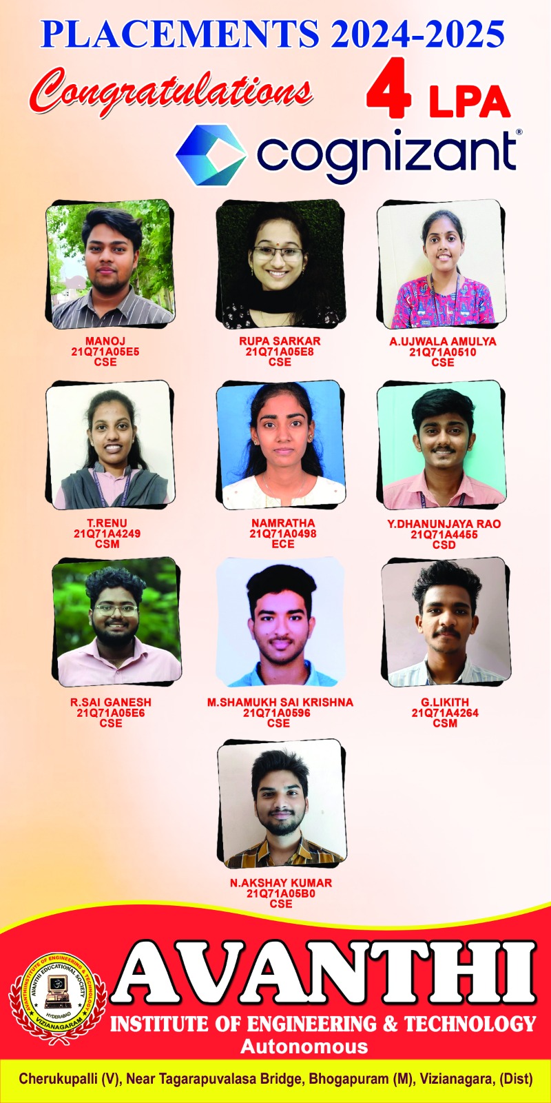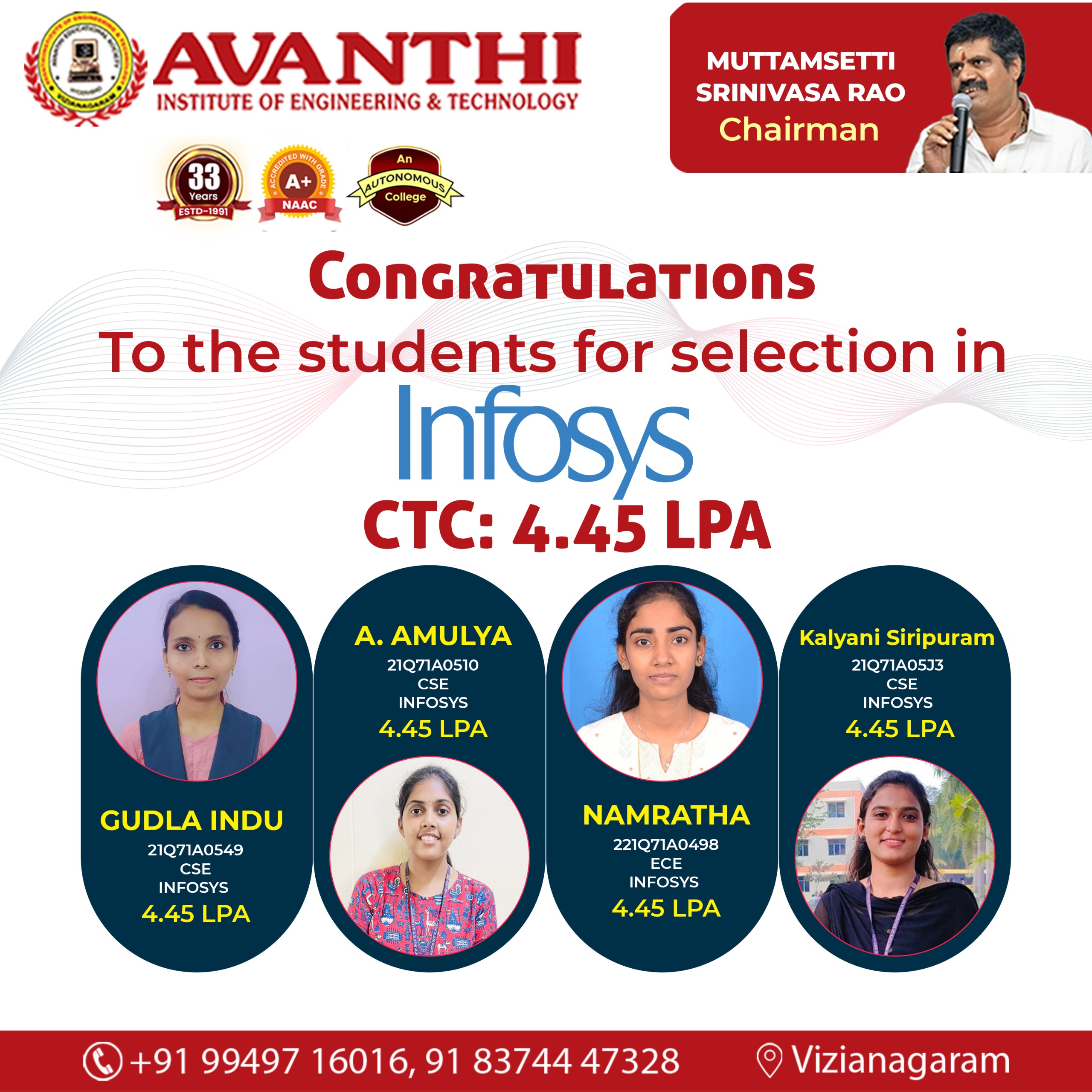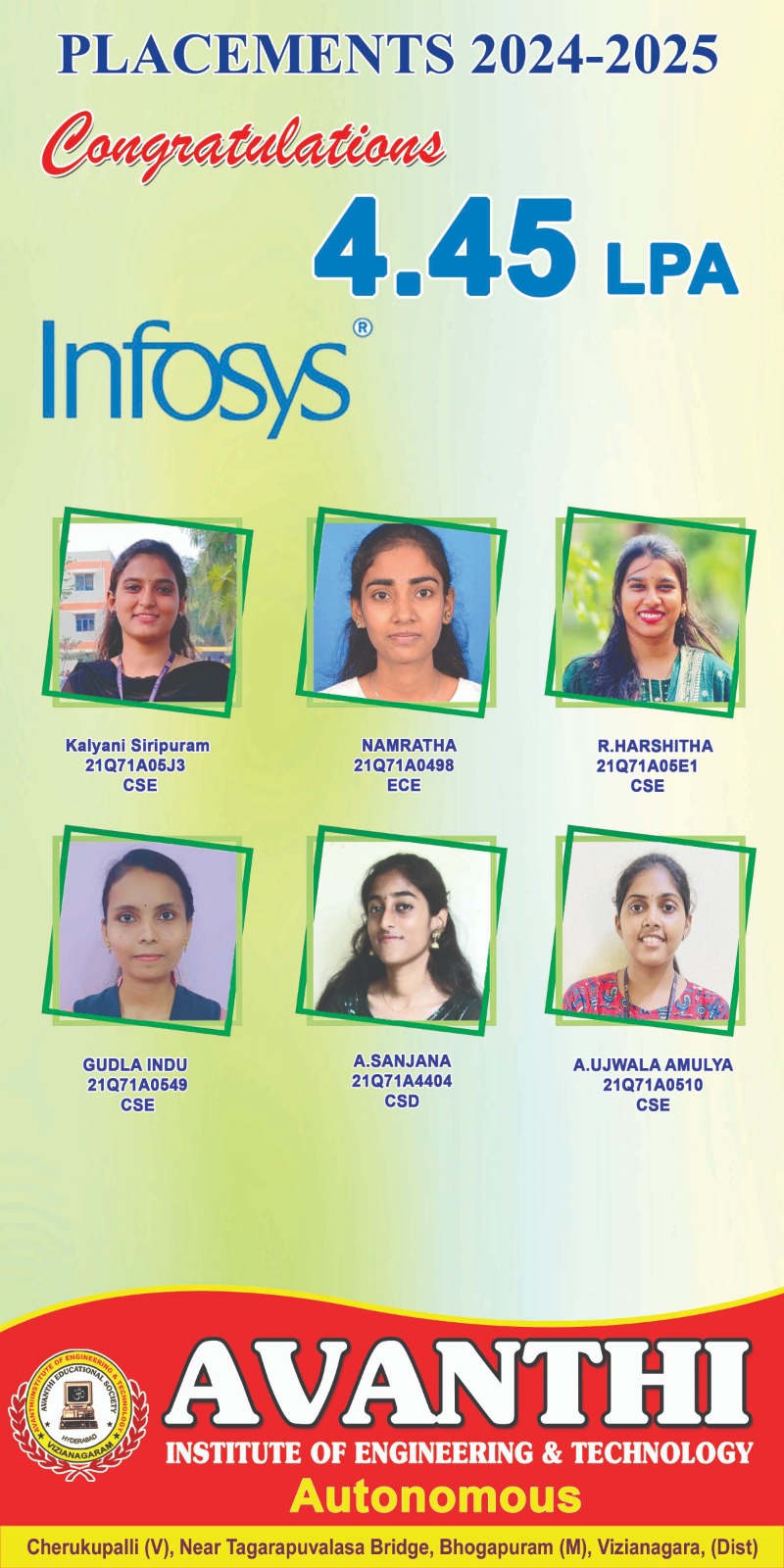 Congratulations to the students for selection in Infosys Ctc 4.45LP