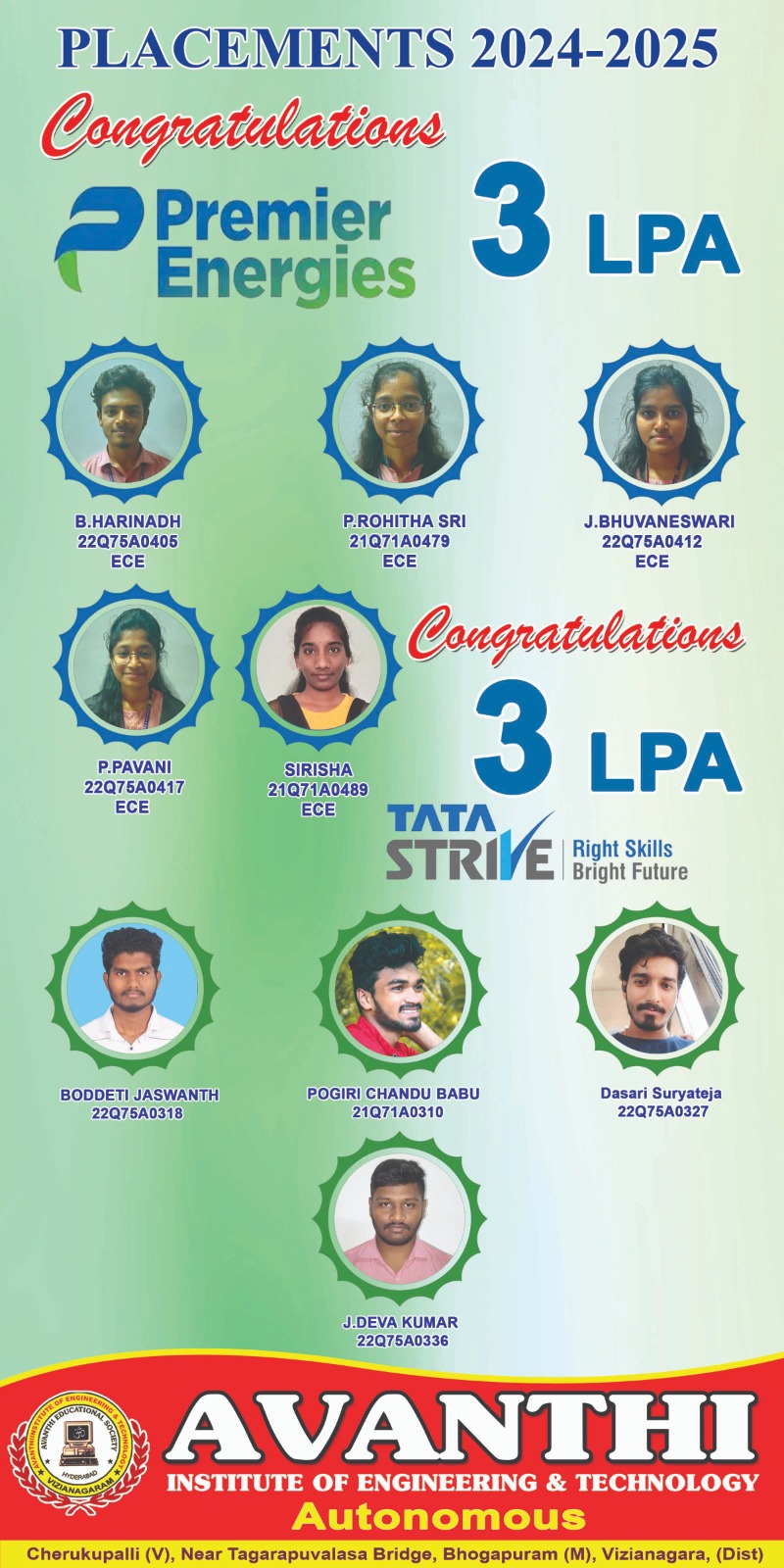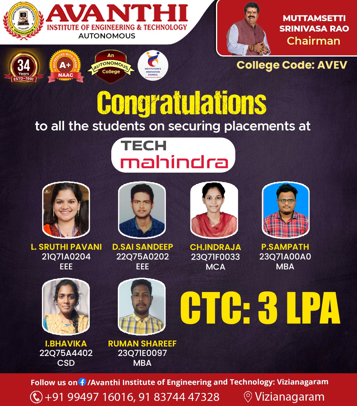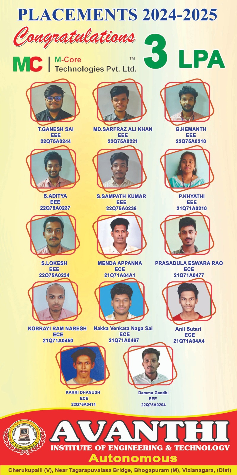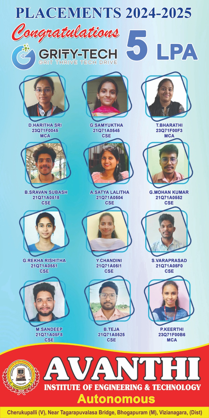 Congratulations to the students for selection in Infosys Ctc 4.45LP